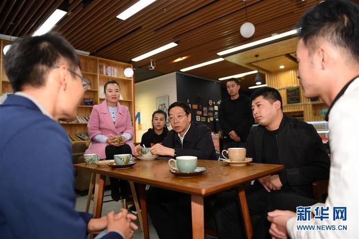 延安市市長薛占海(中)在延安新區898創新空間與青年創業者交流(10月16日攝)。 新華社記者 李一博 攝