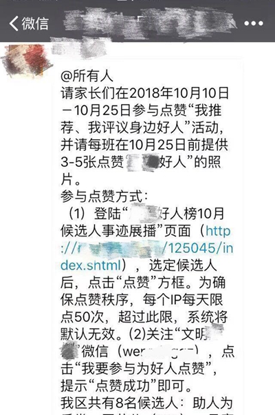 近日,廣東某所幼兒園的家長們又在群里收到老師發的通知:“請家長們在2018年10月10日-10月25日參與點贊‘我推薦、我評議身邊好人’活動,并請每班在10月25日前提供3-5張點贊的照片。”