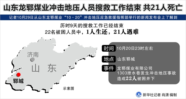 新華社濟南10月29日電(記者陳灝、潘林青)記者29日從山東龍鄆煤業“10·20”沖擊地壓應急救援指揮部舉行的新聞發布會上了解到,歷時9天的搜救工作已經結束。22名被困人員中,1人生還,21人遇難。