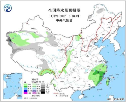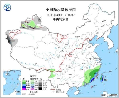 11月1日08時至2日08時,新疆北部和南疆西部山區等地部分地區有中到大雪或雨夾雪,局地有暴雪(10~15毫米)。江南東部、廣東中東部和臺灣島東北部等地的部分地區有中到大雨,其中,廣東東部、福建南部和臺灣等地局地有暴雨或大暴雨(100~110毫米)。新疆北部、南疆盆地、內蒙古西部和甘肅西部等地的部分地區有5~6級及以上風。臺灣海峽、南海東北部海域將有8~9級大風,陣風10~11級(見圖3)。