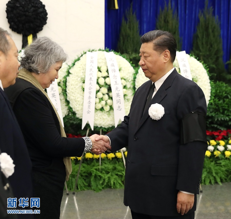 上午9時(shí)30分許,習(xí)近平、李克強(qiáng)、栗戰(zhàn)書、汪洋、王滬寧、趙樂(lè)際、韓正、王岐山、胡錦濤等,在哀樂(lè)聲中緩步來(lái)到王光英同志的遺體前肅立默哀,向王光英同志的遺體三鞠躬,并與王光英同志親屬一一握手,表示慰問(wèn)。