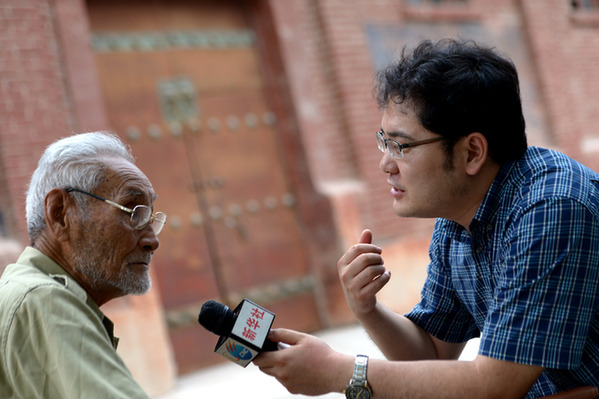 圖為2015年7月,陳晨(右)在陜西省涇陽縣采訪抗戰(zhàn)老兵寧西珍。