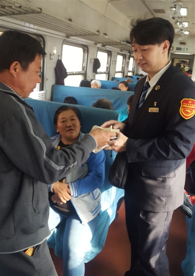 目前,除了四個(gè)大站提供售票服務(wù)外,7053次經(jīng)過的其他20個(gè)小站都是上車補(bǔ)票。圖為列車員正在為乘客補(bǔ)票。