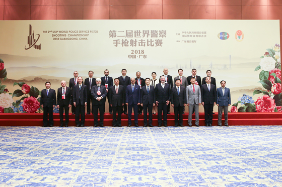 11月13日,公安部常務副部長、第二屆世界警察手槍射擊比賽組委會名譽主席王小洪在廣州同來華出席比賽開幕式的國際警察體育聯合會和各國執法部門官員合影。