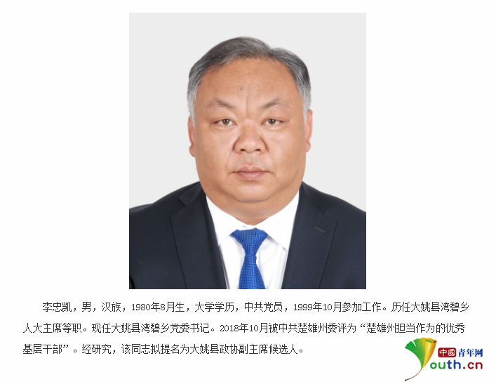 公示稱,李忠凱大學學歷,中共黨員,1999年10月參加工作。歷任大姚縣灣碧鄉人大主席等職。2018年10月被中共楚雄州委評為“楚雄州擔當作為的優秀基層干部”。