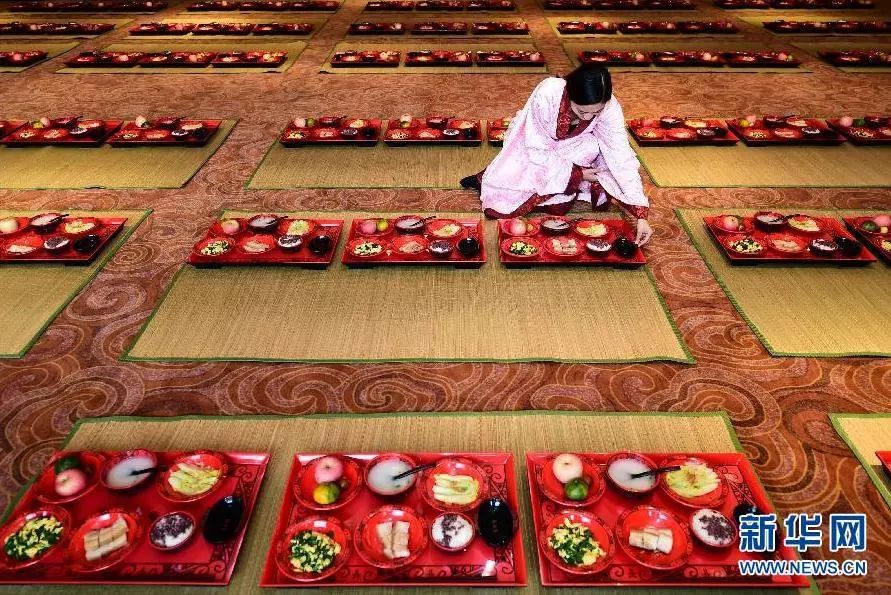 山東曲阜尼山書院,身著漢服的侍者在擺放食物。新華社記者 郭緒雷 攝