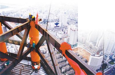 創新之城從不缺乏創新人才。在東海國際公寓施工中,要數空中連廊連接最難,要將總重約700噸的鋼結構連廊提升至180米的高空處。經過長達半個月的討論和研究,邵寶奎和同事最終決定采用液壓整體提升技術,先在地面上將連廊拼接完畢,最后一次性提升至高空。這在工地施工中還很少使用。