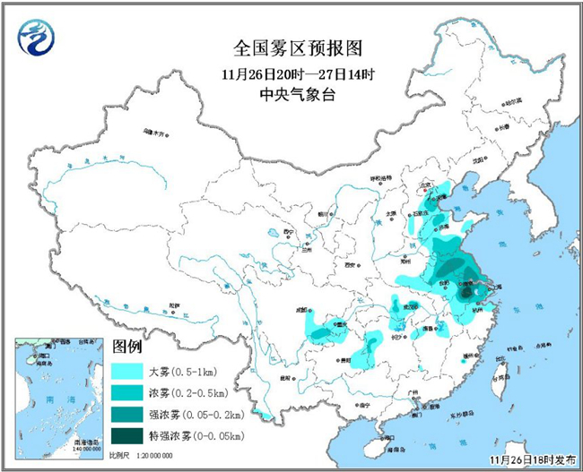 預計未來一周(11月26日至12月2日),受靜穩天氣影響,江蘇、安徽、上海、浙江北部等地的大霧天氣將持續,由于晚上至早晨溫度較低,是霧的多發時段,因此主要影響時段在夜間至次日上午。另外,河南東部、山東南部、湖北中東部、四川盆地以及江南北部的部分地區也多大霧天氣。