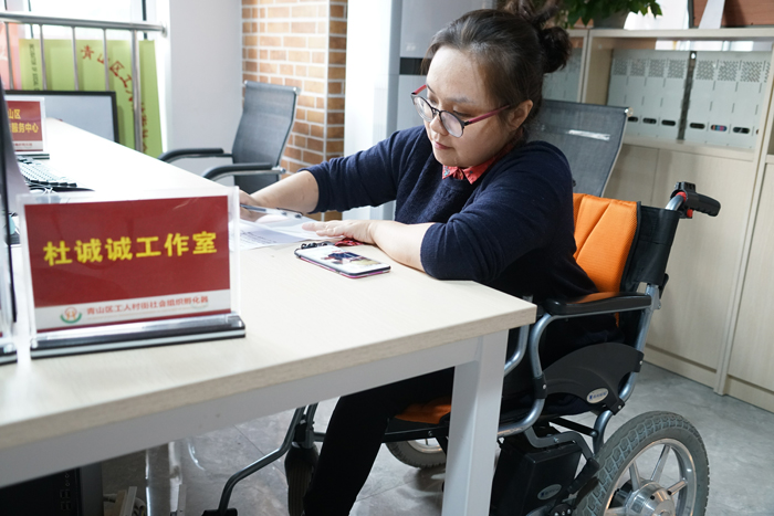 32歲的杜誠誠是一名社區殘疾人協理員,從小患有神經纖維瘤,2009年左腿高位截肢。她沒有因此一蹶不振,而是通過讀書堅強意志,并萌發幫助殘疾人的想法。