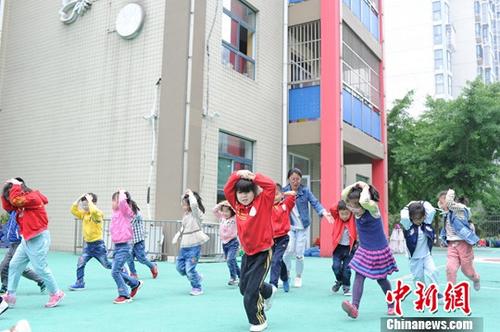資料圖:幼兒園小朋友在進行地震逃生模擬演習。中新社記者 張婭子 攝