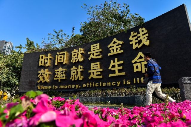 圖為“時間就是金錢,效率就是生命”紀念牌,目前位于廣東省自貿區深圳前海蛇口片區。新華社記者 毛思倩 攝