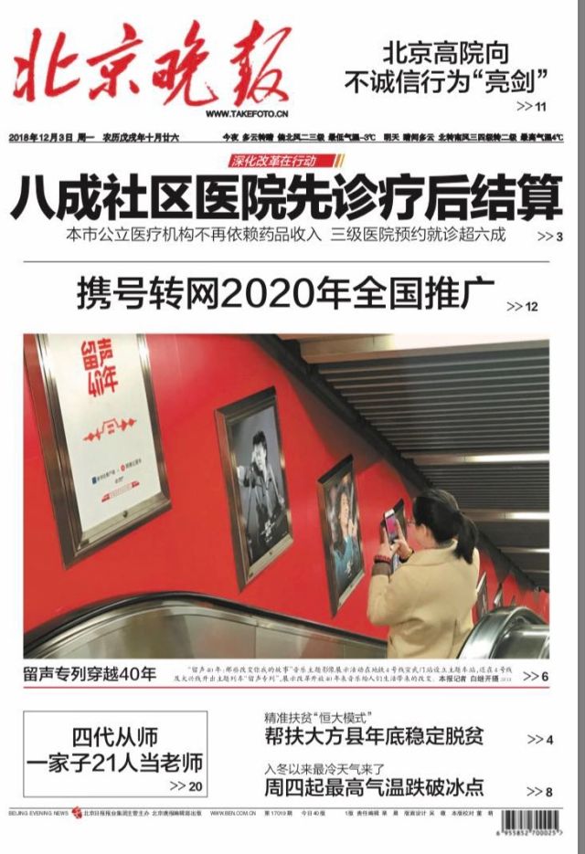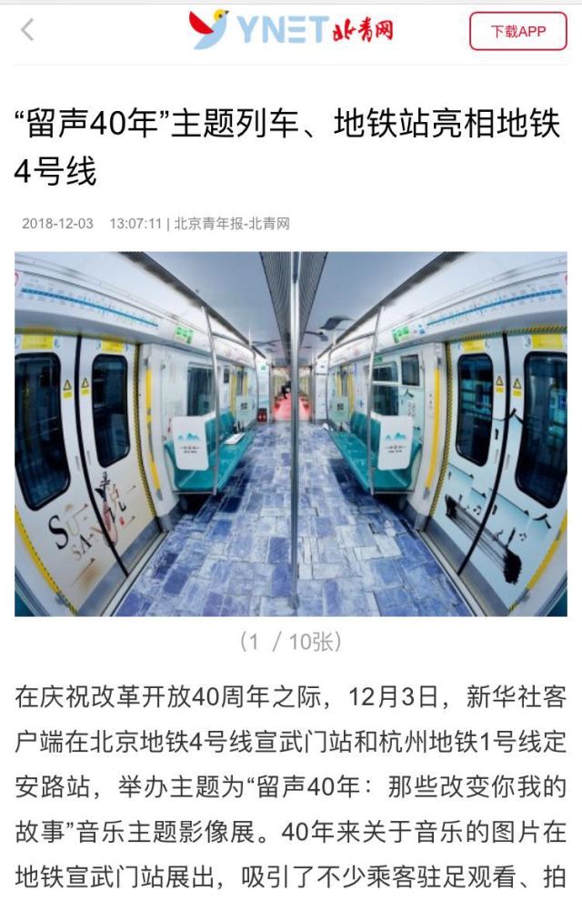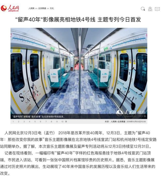 新華社北京12月4日電(記者 牧小湘)為慶祝改革開放40周年,新華社客戶端與網易云音樂、京港地鐵聯合舉辦的“留聲40年:那些改變你我的故事”音樂主題影像展12月3日亮相北京地鐵4號線宣武門站及杭州地鐵1號線定安路站。