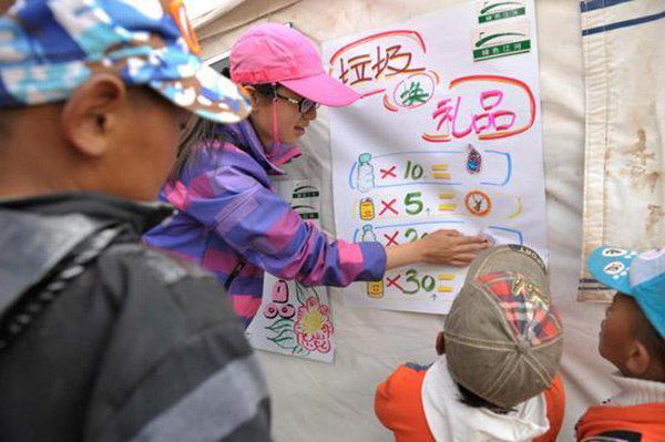 志愿者通過制作的宣傳畫為當地牧民宣傳“垃圾換食品”環保項目