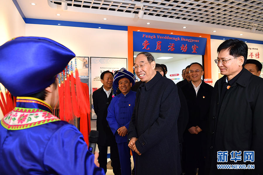在港北區港城街道龍井村,尤權考察了村委辦公樓、便民服務大廳、壯族文化展館,聽取民族團結進步創建等情況介紹,與少數民族群眾親切交談,祝愿他們日子一天比一天好,生活越來越幸福。