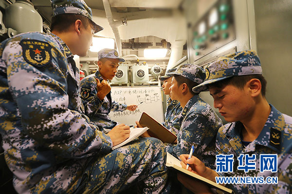 肖海生(左二)利用訓(xùn)練間隙為戰(zhàn)友講解AIP系統(tǒng)常見(jiàn)故障及處置方法(2017年6月2日攝)。 新華社發(fā)(韓林 攝)