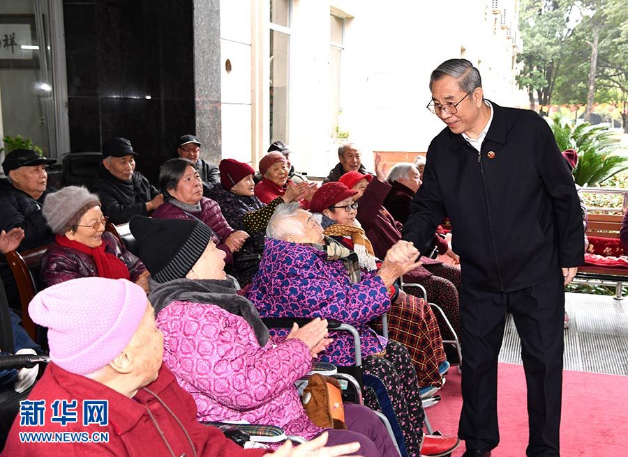 12月12日,全國政協副主席、中央代表團副團長馬飚率中央代表團五分團,帶著以習近平同志為核心的黨中央的親切關懷和全國各族人民的美好祝福,在賀州、桂林看望慰問各族各界干部群眾。這是馬飚在桂林市夕陽紅養老中心看望老人。 新華社記者 周華 攝