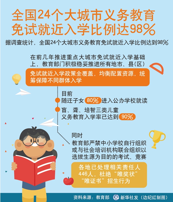 新華社北京12月13日電(記者胡浩)記者13日從教育部新聞發布會上了解到,據調查統計,全國24個大城市義務教育免試就近入學比例達到98%。