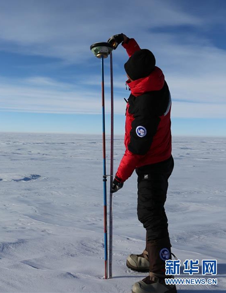 中國第35次南極科考隊隊員、武漢大學(xué)中國南極測繪研究中心的楊元德在測量冰流速(12月22日攝)。新華社記者 劉詩平 攝