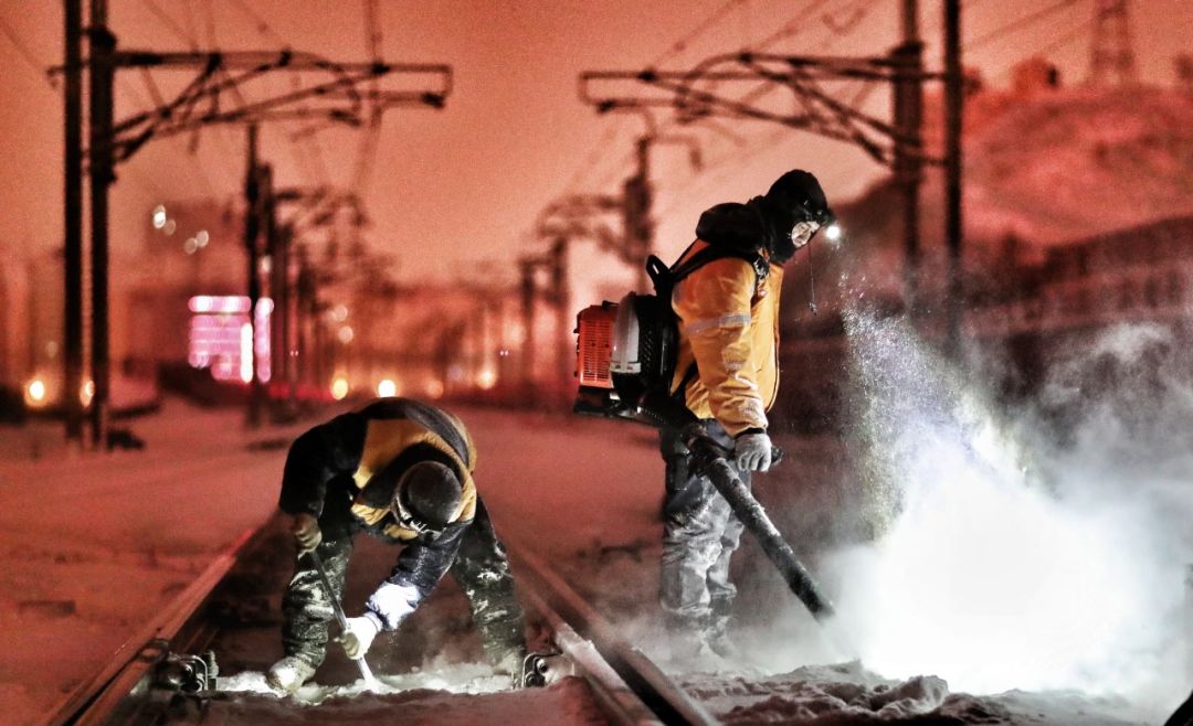 2018-12-05,新疆烏魯木齊站。大雪后,高鐵工務(wù)人對(duì)高鐵線路的道岔進(jìn)行除冰清雪作業(yè),保障高鐵安全運(yùn)行。作者:擺風(fēng)亮
