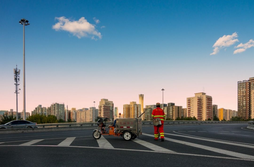 2018-10-09,北京廣渠門橋。你是城市美容師,你梳理著大街小巷,你是城市一景,與藍(lán)天相映成輝。作者:月份牌