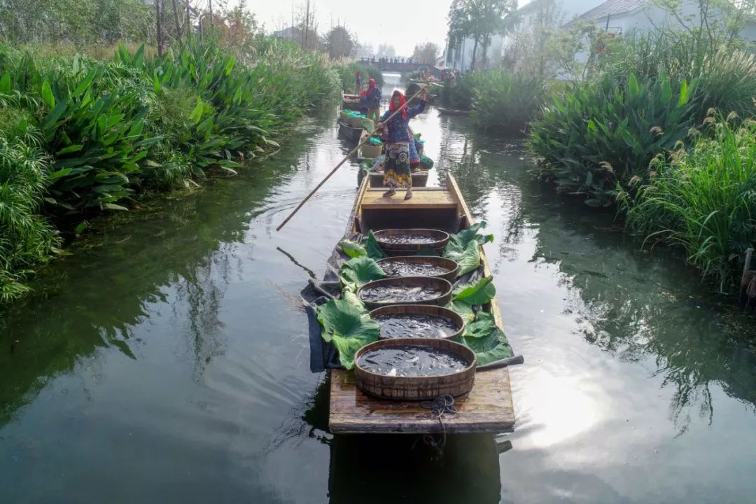2018-09-23,江蘇泰州興化。在江蘇省興化市東羅村,農民在“水上市集”展示特色農產品。當日是首屆中國農民豐收節,全國各地舉行豐富多彩的活動慶祝豐收。作者:湯德宏