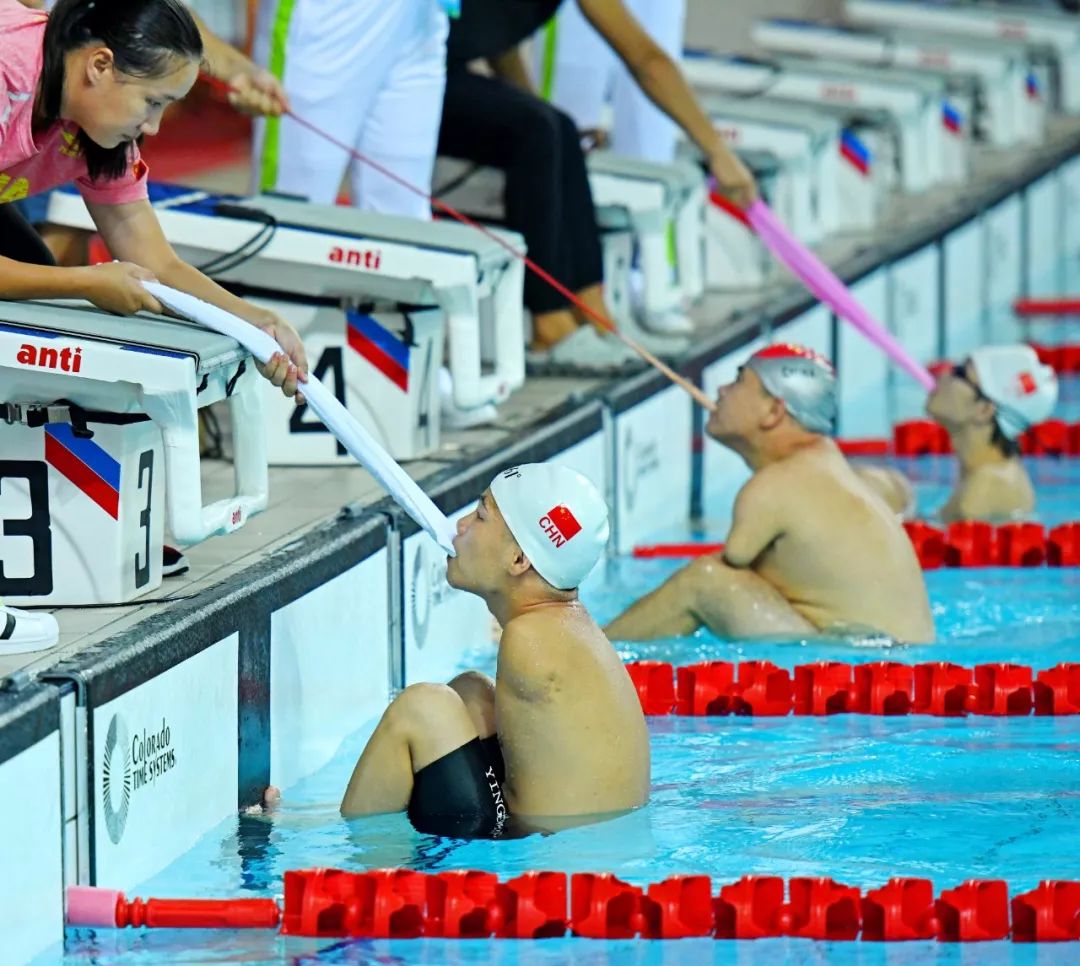 2018-08-28,廣東省肇慶市西江學院游泳館。三名重度殘障選手在游泳賽道上準備一拼。當日,廣東省第八屆殘疾人運動會游泳項目舉行決賽。作者:文兄言成