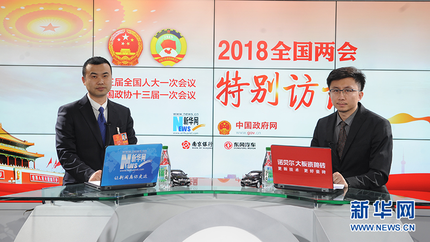 3月9日,全國人大代表、遼寧三溝酒業有限責任公司董事長吳京耕(左)做客新華網2018全國兩會特別訪談。新華網?郭小天攝