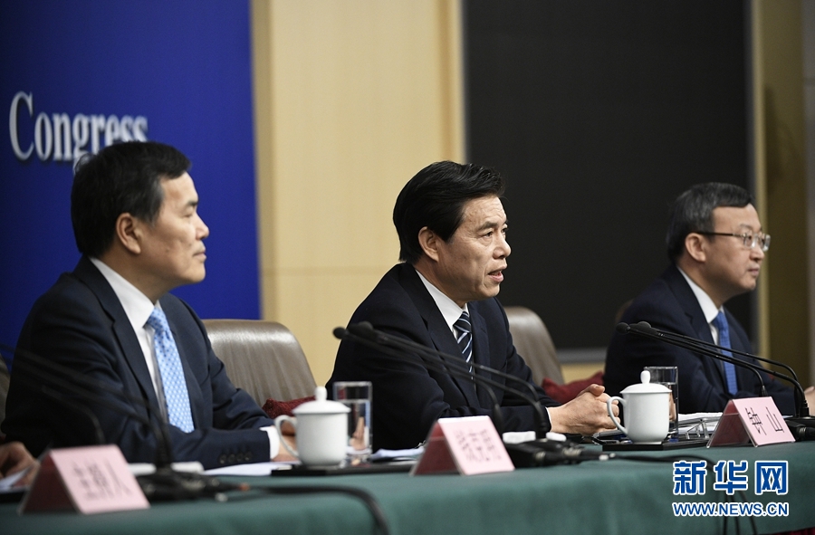 3月11日,十三屆全國人大一次會(huì)議新聞中心舉行記者會(huì),邀請(qǐng)商務(wù)部部長鐘山、副部長兼國際貿(mào)易談判副代表王受文、副部長錢克明就“推動(dòng)形成全面開放新格局推動(dòng)商務(wù)事業(yè)高質(zhì)量發(fā)展”相關(guān)問題回答中外記者提問。 新華社記者 王鵬 攝