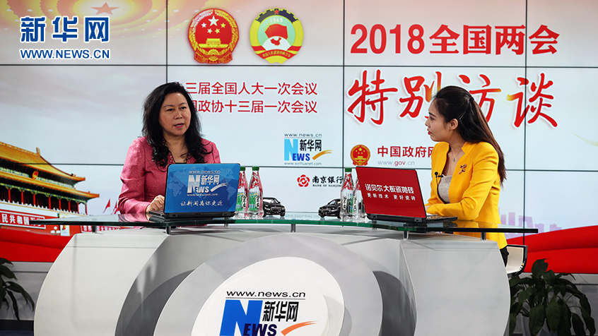 圖為全國政協(xié)委員、新大陸科技集團(tuán)總裁王晶做客新華網(wǎng)2018全國兩會特別訪談。新華網(wǎng) 郭小天攝