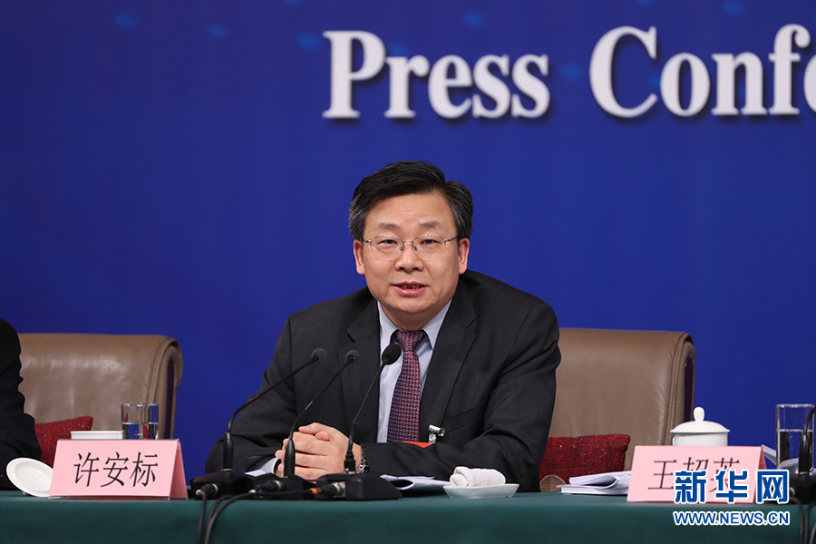 3月12日,十三屆全國人大一次會議新聞中心在梅地亞中心多功能廳舉行記者會,邀請十二屆全國人大內(nèi)司委副主任委員王勝明、財(cái)經(jīng)委副主任委員烏日圖、教科文衛(wèi)委副主任委員吳恒、環(huán)資委委員呂彩霞,全國人大常委會法工委副主任王超英、副主任許安標(biāo)就“人大立法工作”相關(guān)問題回答中外記者提問。圖為全國人大常委會法工委副主任許安標(biāo)回答記者提問。新華網(wǎng)/中國政府網(wǎng) 翟子赫 攝