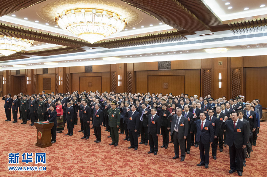 3月18日,十三屆全國人大一次會議在北京人民大會堂舉行第六次全體會議。159位候選人當(dāng)選為第十三屆全國人民代表大會常務(wù)委員會委員。這是新當(dāng)選的第十三屆全國人民代表大會常務(wù)委員會委員進(jìn)行憲法宣誓。新華社記者 李學(xué)仁 攝