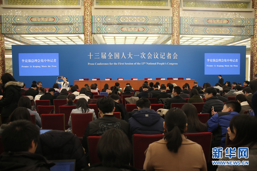 3月20日上午,十三屆全國人大一次會議閉幕后,國務院總理李克強將在人民大會堂三樓金色大廳會見采訪十三屆全國人大一次會議的中外記者并回答記者提出的問題。圖為記者會現場。 新華網/中國政府網 翟子赫 攝
