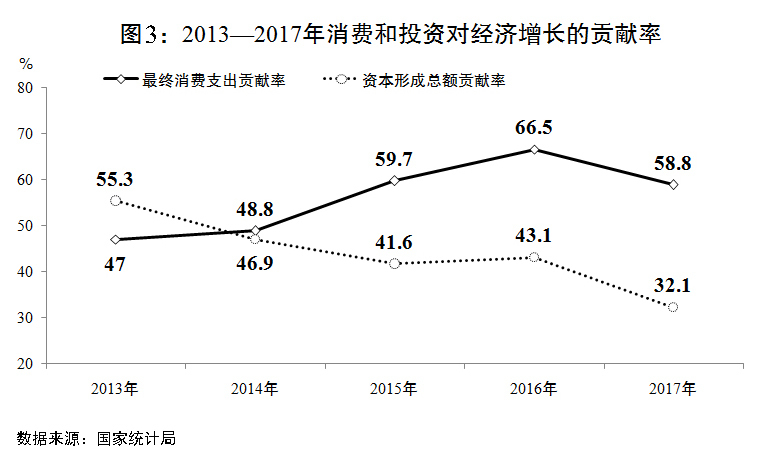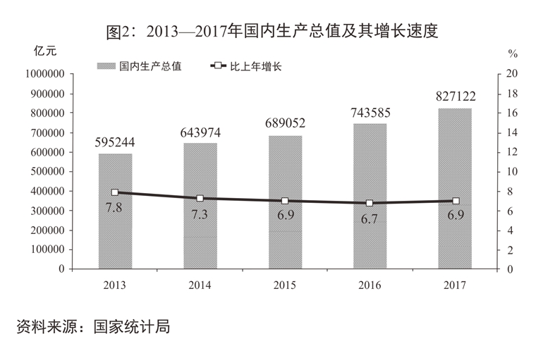 總的來(lái)看,2017年經(jīng)濟(jì)運(yùn)行穩(wěn)中向好態(tài)勢(shì)持續(xù)發(fā)展,決勝全面建成小康社會(huì)又向前邁出堅(jiān)實(shí)一步。在國(guó)內(nèi)外經(jīng)濟(jì)形勢(shì)極其錯(cuò)綜復(fù)雜的情況下,經(jīng)濟(jì)社會(huì)發(fā)展取得這樣的成績(jī)來(lái)之不易,這是以習(xí)近平同志為核心的黨中央堅(jiān)強(qiáng)領(lǐng)導(dǎo)的結(jié)果,是習(xí)近平新時(shí)代中國(guó)特色社會(huì)主義思想科學(xué)指引的結(jié)果,是黨的十八大以來(lái)黨中央、國(guó)務(wù)院一系列重大方針政策和重大舉措累積效應(yīng)的結(jié)果,更是全黨全國(guó)各族人民共同奮斗、各方面工作久久為功的結(jié)果。五年來(lái),各地區(qū)各部門以習(xí)近平新時(shí)代中國(guó)特色社會(huì)主義思想為指引,堅(jiān)持穩(wěn)中求進(jìn)工作總基調(diào),貫徹新發(fā)展理念,“十二五”規(guī)劃勝利完成,“十三五”規(guī)劃順利實(shí)施。一是經(jīng)濟(jì)實(shí)力顯著增強(qiáng)。國(guó)內(nèi)生產(chǎn)總值從2012年的54萬(wàn)億元增加到82.7萬(wàn)億元,年均增長(zhǎng)7.1%,對(duì)世界經(jīng)濟(jì)增長(zhǎng)的貢獻(xiàn)率超過(guò)30%。二是發(fā)展質(zhì)量和效益明顯提高。全國(guó)一般公共預(yù)算收入從11.7萬(wàn)億元增至17.3萬(wàn)億元。全員勞動(dòng)生產(chǎn)率從人均7.3萬(wàn)元提高到10萬(wàn)元以上。居民人均可支配收入從1.7萬(wàn)元增至2.6萬(wàn)元,增速總體快于經(jīng)濟(jì)增長(zhǎng),城鄉(xiāng)居民收入倍差由2.88∶1下降至2.71∶1。單位國(guó)內(nèi)生產(chǎn)總值能耗降低20.9%。三是經(jīng)濟(jì)結(jié)構(gòu)發(fā)生重大變革。需求結(jié)構(gòu)“消費(fèi)超投資”,最終消費(fèi)對(duì)經(jīng)濟(jì)增長(zhǎng)的貢獻(xiàn)率提高了近4個(gè)百分點(diǎn)。產(chǎn)業(yè)結(jié)構(gòu)“三產(chǎn)超二產(chǎn)”,服務(wù)業(yè)占國(guó)民經(jīng)濟(jì)的比重不斷上升。區(qū)域發(fā)展格局不斷優(yōu)化,新型城鎮(zhèn)化扎實(shí)推進(jìn),8000多萬(wàn)農(nóng)業(yè)轉(zhuǎn)移人口成為城鎮(zhèn)居民。四是新舊動(dòng)能加快接續(xù)轉(zhuǎn)換。供給側(cè)結(jié)構(gòu)性改革扎實(shí)推進(jìn),有效改善了市場(chǎng)供求關(guān)系和企業(yè)盈利狀況。創(chuàng)新驅(qū)動(dòng)發(fā)展戰(zhàn)略深入實(shí)施,天宮、蛟龍、天眼、悟空、墨子、大飛機(jī)等重大科技成果相繼問世,新產(chǎn)業(yè)新業(yè)態(tài)新模式層出不窮,傳統(tǒng)產(chǎn)業(yè)通過(guò)改造升級(jí)煥發(fā)生機(jī)。五是市場(chǎng)主體活力持續(xù)釋放。營(yíng)商環(huán)境不斷優(yōu)化,產(chǎn)權(quán)保護(hù)不斷加強(qiáng),公平競(jìng)爭(zhēng)市場(chǎng)環(huán)境進(jìn)一步健全。五年來(lái),國(guó)務(wù)院部門行政審批事項(xiàng)削減44%,中央層面核準(zhǔn)的企業(yè)投資項(xiàng)目減少90%,中央政府定價(jià)項(xiàng)目縮減80%。大眾創(chuàng)業(yè)萬(wàn)眾創(chuàng)新蓬勃發(fā)展,全國(guó)日均新登記企業(yè)從5400戶上升到1.66萬(wàn)戶,活躍度保持在70%左右,經(jīng)濟(jì)社會(huì)發(fā)展內(nèi)生動(dòng)力不斷增強(qiáng)。六是改革開放全面深化。重要領(lǐng)域和關(guān)鍵環(huán)節(jié)改革取得突破性進(jìn)展,主要領(lǐng)域改革主體框架基本確立。“一帶一路”倡議由構(gòu)想逐步變?yōu)楝F(xiàn)實(shí),貿(mào)易大國(guó)地位更加鞏固,利用外資保持穩(wěn)定增長(zhǎng),我國(guó)對(duì)世界經(jīng)濟(jì)發(fā)展的影響力大幅提升。七是民生福祉得到有效保障。城鎮(zhèn)新增就業(yè)6600萬(wàn)人以上,脫貧攻堅(jiān)取得決定性進(jìn)展,貧困人口減少6800多萬(wàn)。覆蓋城鄉(xiāng)居民的社會(huì)保障體系基本建立,基本公共服務(wù)均等化程度不斷提高。八是生態(tài)環(huán)境建設(shè)保護(hù)力度持續(xù)加大。大氣、水、土壤污染防治行動(dòng)取得明顯成效,重點(diǎn)區(qū)域PM2.5平均濃度下降30%左右,生態(tài)文明制度體系加快形成,環(huán)境狀況得到改善。