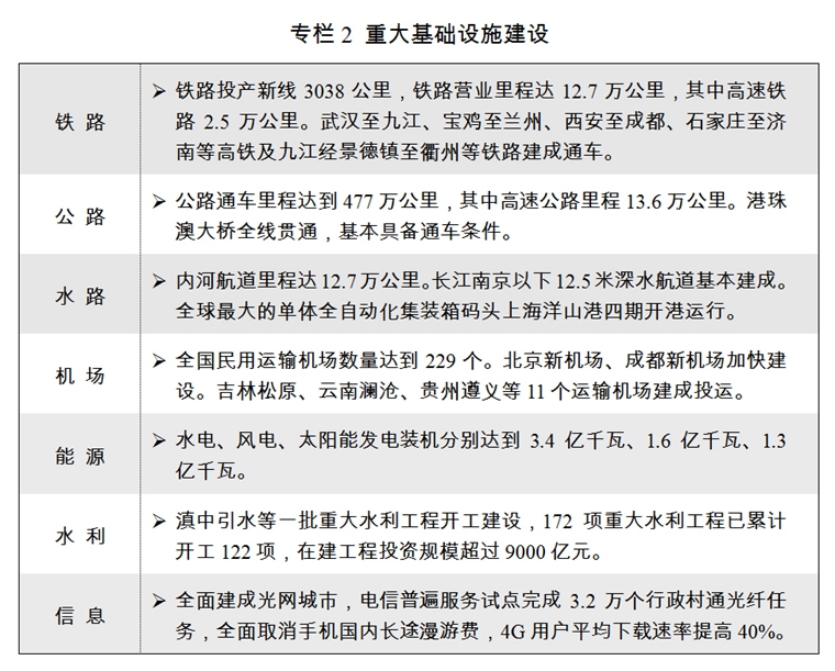 四是加強(qiáng)水利交通能源等基礎(chǔ)設(shè)施建設(shè)。今年要完成鐵路投資7320億元、公路水運(yùn)投資1.8萬(wàn)億元左右,水利在建投資規(guī)模達(dá)到1萬(wàn)億元。再開工一批重大水利工程,加強(qiáng)中小河流治理、小型病險(xiǎn)水庫(kù)除險(xiǎn)加固等水利薄弱環(huán)節(jié)建設(shè)。加快建設(shè)北京至沈陽(yáng)、商丘經(jīng)合肥至杭州、鄭州至萬(wàn)州高鐵,開工建設(shè)北京至雄安、和田至若羌等鐵路。有序發(fā)展高速公路,支持普通國(guó)省干線提級(jí)改造。進(jìn)一步完善通江達(dá)海、干支銜接的航道網(wǎng)絡(luò),提高干線航道通航能力和支線航道等級(jí)。積極推進(jìn)北京、成都、青島等新機(jī)場(chǎng)建設(shè),推進(jìn)一批樞紐機(jī)場(chǎng)改擴(kuò)建和支線機(jī)場(chǎng)項(xiàng)目建設(shè)。支持符合條件的城市有序發(fā)展城市軌道交通。推動(dòng)“互聯(lián)網(wǎng)+”便捷交通建設(shè),提升綜合交通服務(wù)質(zhì)量。加快構(gòu)建便捷高效、綠色安全骨干物流基礎(chǔ)設(shè)施網(wǎng)絡(luò)。落實(shí)能源生產(chǎn)和消費(fèi)革命戰(zhàn)略,推進(jìn)能源革命試點(diǎn)示范,開展非化石能源跨越發(fā)展行動(dòng),構(gòu)建清潔能源消納長(zhǎng)效機(jī)制,加快傳統(tǒng)能源清潔高效利用,加強(qiáng)電網(wǎng)、油氣管網(wǎng)布局優(yōu)化和互聯(lián)互通,增強(qiáng)天然氣供給保障能力和油氣儲(chǔ)備應(yīng)急能力。