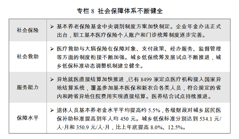 二是社會(huì)保障體系不斷健全。養(yǎng)老保險(xiǎn)制度頂層設(shè)計(jì)取得關(guān)鍵性進(jìn)展,劃轉(zhuǎn)部分國(guó)有資本充實(shí)社保基金實(shí)施方案印發(fā)實(shí)施。城鄉(xiāng)居民基本醫(yī)療保險(xiǎn)制度整合深入推進(jìn),異地就醫(yī)直接結(jié)算取得重要突破,所有省級(jí)異地就醫(yī)結(jié)算系統(tǒng)、所有統(tǒng)籌地區(qū)均與國(guó)家異地就醫(yī)結(jié)算系統(tǒng)實(shí)現(xiàn)對(duì)接。高齡津貼制度已在全國(guó)31個(gè)省份和新疆生產(chǎn)建設(shè)兵團(tuán)實(shí)現(xiàn)全覆蓋。城鎮(zhèn)職工基本養(yǎng)老和城鄉(xiāng)居民養(yǎng)老保險(xiǎn)參保人數(shù)分別達(dá)到4.02億人和5.13億人。城鎮(zhèn)棚戶區(qū)住房改造開工609萬(wàn)套。