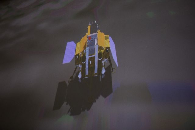 圖為1月3日在北京航天飛行控制中心拍攝的嫦娥四號探測器展開太陽翼(示意圖)。1月3日10時26分,嫦娥四號探測器自主著陸在月球背面南極-艾特肯盆地內的馮·卡門撞擊坑內,實現人類探測器首次在月球背面軟著陸。新華社記者 金立旺 攝