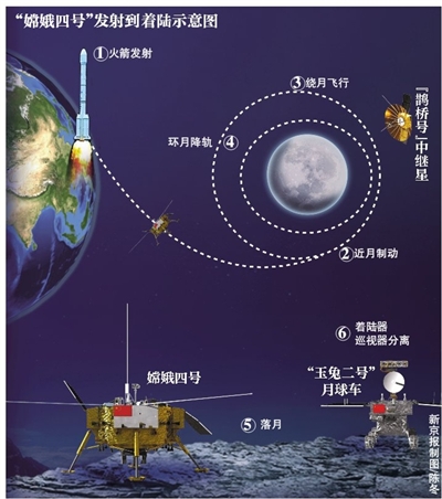 嫦娥四號去年12月8日搭乘火箭發射,12月12日進入環月軌道,12月30日進入月球背面著陸準備軌道。12月12日后,嫦娥四號進行了2次環月軌道修正,與“鵲橋號”中繼星進行了4次中繼鏈路測試,開展激光測距、三維成像等導航敏感器在軌測試。