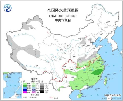1月4日08時至5日08時,黑龍江中東部、北疆北部和南疆西部山區(qū)、青海中東部、西藏東部和西部、川西高原、陜西中南部、湖北西部、黃淮西部和東南部等地的部分地區(qū)有小雪或雨夾雪;江漢、江淮及其以南大部地區(qū)、西南地區(qū)東部和南部等地的部分地區(qū)有小到中雨,江西中北部、浙江中部和廣西東北部等地的部分地區(qū)有大雨(25~35毫米)。內(nèi)蒙古中北部、黑龍江東北部、遼東半島和山東半島等地的部分地區(qū)有4~6級及以上風(fēng)(見圖1)。北部灣、瓊州海峽、廣東西部沿岸部分海域?qū)⒂写箪F天氣。