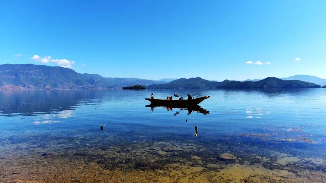 2018-11-02,云南瀘沽湖。藍天白云,小船悠悠。作者:遠行客