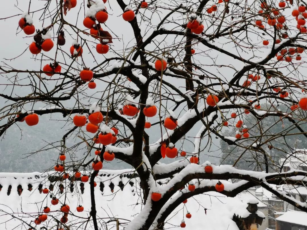 2018-12-31,江西婺源。在中國最美鄉村婺源,古村落篁嶺喜降瑞雪,滿樹的柿子如一個個小燈籠,紅紅火火,喜迎新年。作者:董立新