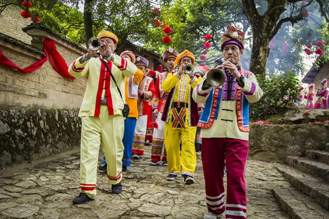 2018-12-29,廣西宜州流河寨。壯鄉傳統婚禮里的吹嗩吶。作者:藍景惠