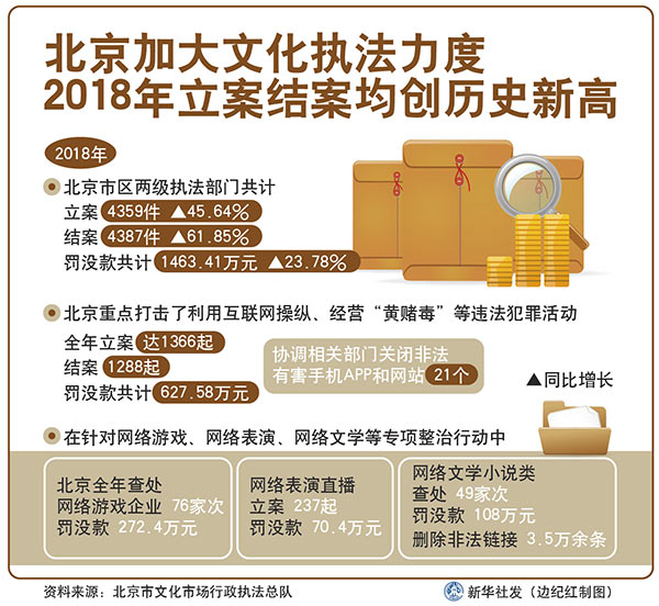 圖表:北京加大文化執法力度 2018年立案結案均創歷史新高 新華社發 邊紀紅 制圖