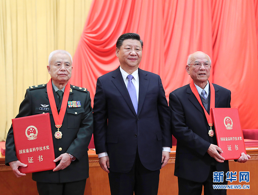 1月8日,2018年度國家科學技術獎勵大會在北京人民大會堂隆重舉行。中共中央總書記、國家主席、中央軍委主席習近平向獲得2018年度國家最高科學技術獎的哈爾濱工業大學劉永坦院士(右)和中國人民解放軍陸軍工程大學錢七虎院士(左)頒獎。 新華社記者 謝環馳 攝