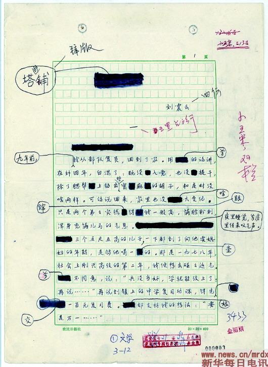 此次展出的手稿,還有手寫(xiě)于農(nóng)民日?qǐng)?bào)社稿紙的劉震云小說(shuō)《塔鋪》。與莫言《透明的紅蘿卜》類(lèi)似的,這篇“新寫(xiě)實(shí)小說(shuō)”代表作的篇名也是修改過(guò)的,原名叫“河堤”,后來(lái)才改為“塔鋪”。盡管是謄清的手稿,其中仍充滿(mǎn)大量細(xì)微的刪減與成塊的涂抹。“不小心”改為“無(wú)意間”,“聚在”改為“聚到”,連“地”“的”“還”“又”等字眼也在斟酌后刪去,體現(xiàn)了作者對(duì)凝練精準(zhǔn)、不冗不贅的語(yǔ)言風(fēng)格的極致追求。