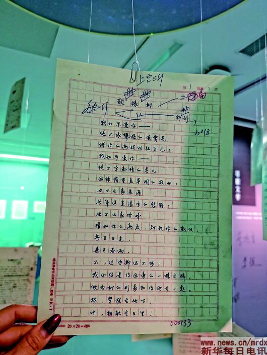 舒婷的詩(shī)歌代表作《致橡樹(shù)》就寫(xiě)在42年前的兩頁(yè)“北京市電車(chē)公司印刷廠”印制的紅色格子稿紙上。如今它被串上線(xiàn),懸掛在中國(guó)現(xiàn)代文學(xué)館的展廳中央。