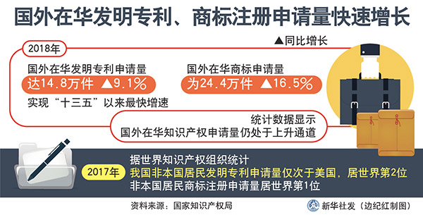 據(jù)世界知識產(chǎn)權(quán)組織統(tǒng)計(jì),2017年,我國非本國居民發(fā)明專利申請量僅次于美國,居世界第2位,非本國居民商標(biāo)注冊申請量居世界第1位。