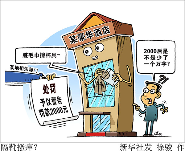 2018年11月,國內(nèi)十幾家高端酒店連續(xù)曝出衛(wèi)生亂象。近日上海相關(guān)部門對涉事酒店分別處以警告、罰款2000元的處罰,引發(fā)網(wǎng)友熱議:被罰金額甚至抵不上有的酒店單間一晚房價(jià)。業(yè)界呼吁,“亮劍”酒店亂象還需“劍更鋒利”。