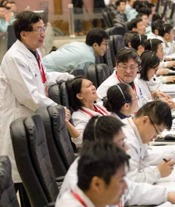 1月3日,嫦娥四號落月的一刻,74歲的中國航天科技集團五院深空探測和空間科學首席科學家、嫦娥一號衛星總設計師葉培建院士走向正在前排工作席的嫦娥四號探測器項目執行總監張熇,兩代“嫦娥人”的手,緊緊地握在了一起。新華社記者金立旺攝