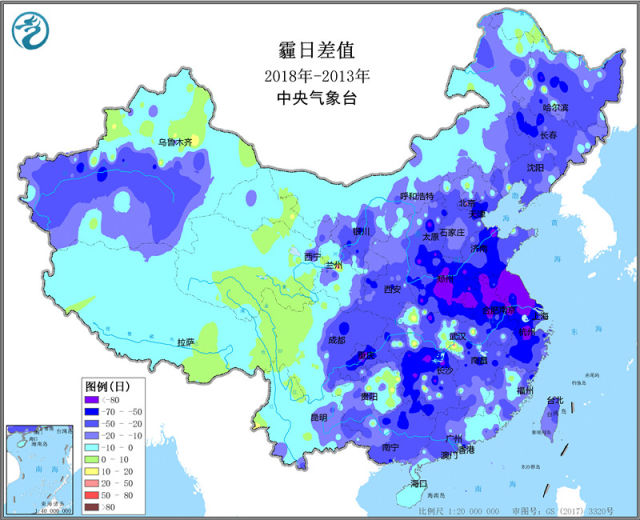 根據(jù)中央氣象臺的統(tǒng)計,全國大部分地區(qū)2018年霾日較2013年都有大幅下降,其中京津冀及周邊大部分地區(qū)霾日數(shù)下降超過30天,部分地區(qū)下降超過50天;長三角地區(qū)霾日數(shù)下降普遍超過50天;珠三角地區(qū)霾日數(shù)也出現(xiàn)明顯下降,部分地區(qū)下降超過30天;汾渭平原霾日數(shù)下降普遍超過20天;川渝地區(qū)霾日數(shù)普遍下降超過20天。