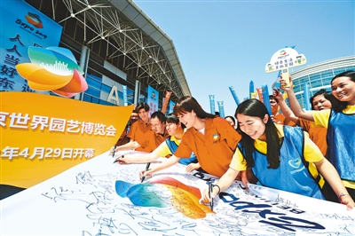 北京延慶區團委組織志愿者在世園會誓師行動旗幟上簽名(資料照片)。本報記者 賀勇攝